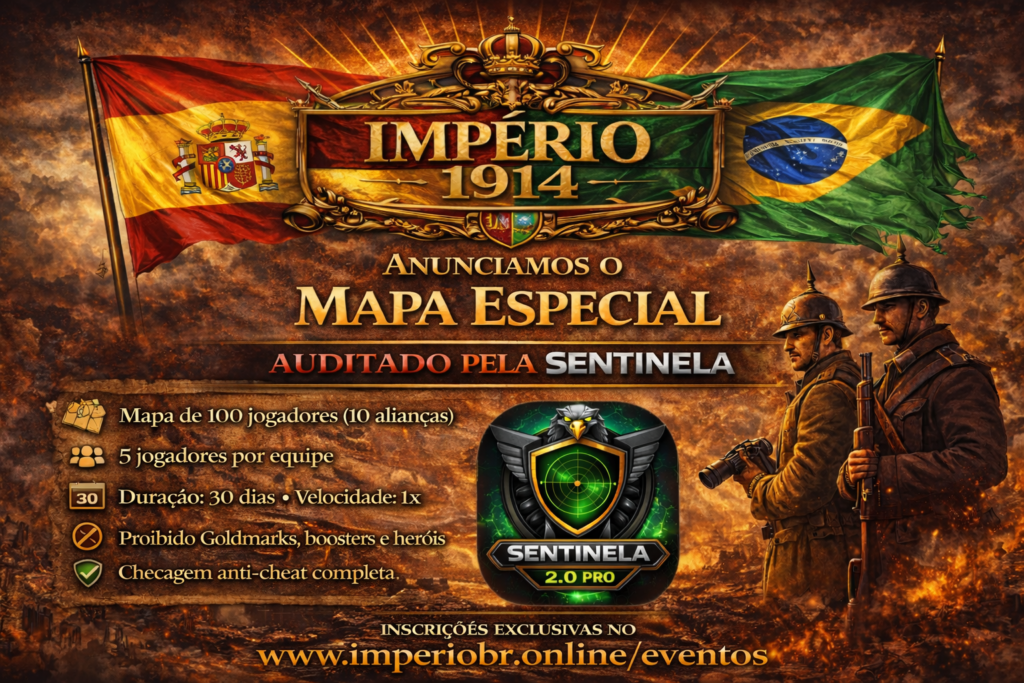 Evento casual oficial da Comunidade Império 1914, 🛡️ O mapa será auditado integralmente pelo Sistema Sentinela 2.0 PRO. 📜 A participação implica concordância total com o regulamento oficial do evento.
